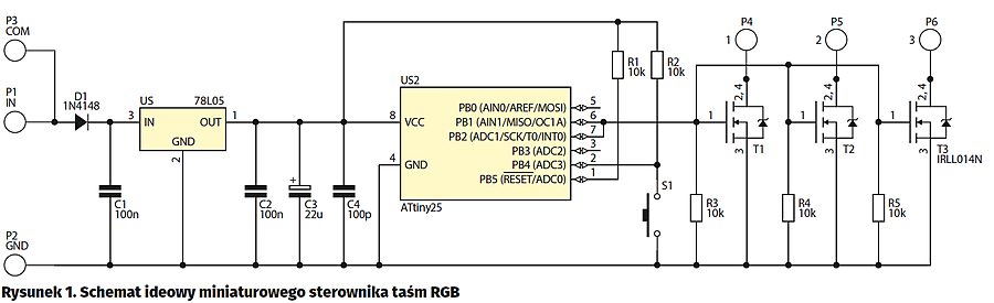 Schemat ideowy układu widnieje na rysunku 1. Napięcie z zasilacza podawane jest na zaciski P1 i P2. Stabilizator US1 dostarcza napięcie 5 V dla mikrokontrolera ATtiny25. Dioda D1 zabezpiecza układ stabilizatora przed zniszczeniem w razie odwrotnego przyłączenia zasilania. Przycisk S1 służy do wyboru programu, rezystory R1 i R2 utrzymują wysoki poziom logiczny na wejściach układu scalonego. Poszczególne łańcuchy diod są załączane przez tranzystory MOSFET T1…T3, których bramki dołączono bezpośrednio do mikrokontrolera. Rolą rezystorów R3…R5 jest rozładowanie pojemności bramka-źródło tranzystorów wtedy, gdy mikrokontroler nie działa – na przykład, odwrotnie włączony zasilacz spowodował zatkanie diody D1. Łańcuchy diod zasilane są przebiegiem o zmiennym wypełnieniu (PWM), o częstotliwości ok. 560 Hz.