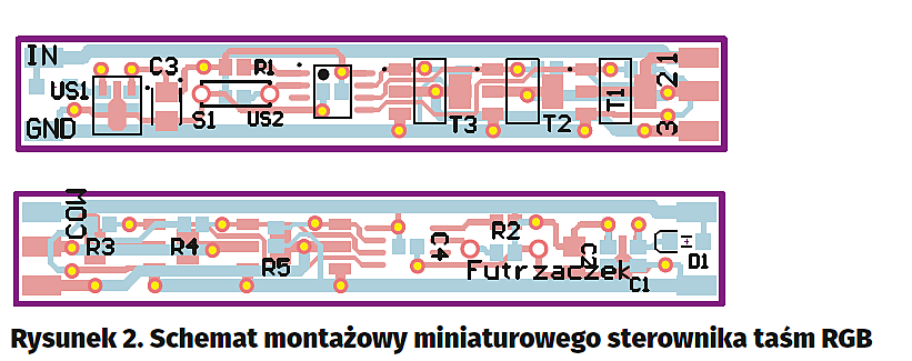 Układ został zmontowany na dwustronnej płytce drukowanej o wymiarach 73×11 mm, której wzór ścieżek znajduje się na rysunku2.