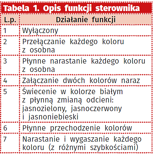 Sterownik ma 6 różnych programów oraz możliwość wyłączenia taśmy. Wybrana opcja jest zapamiętywana w pamięci nieulotnej EEPROM mikrokontrolera i odczytywana po włączeniu zasilania. Poszczególne efekty przewijane są w zamkniętej pętli. Można je zmieniać przyciskając klawisz S1. Ich opis umieszczono w tabeli1.
