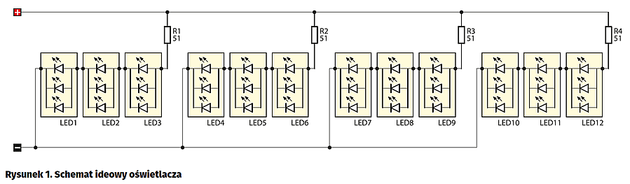 Schemat ideowy oświetlacza LED pokazano na rysunku 1, natomiast montażowy na rysunku 2. Diody LED zostały połączone szeregowo-równolegle w 4 grupy, po 3 diody każda. Prąd płynący przez diody jest ograniczany za pomocą rezystorów R1…R4. Dla ułatwienia montażu oświetlacza, na płytce drukowanej umieszczono dwa niewielkie „uszka” ułatwiające jego przymocowanie. Oświetlacz powinien być zasilany napięciem 12 V DC.