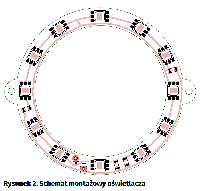 Oświetlacz pierścieniowy to płytka drukowana o średnicy wewnętrznej 54 mm, na której powierzchni zamontowano 12 diod LED typu 5050 z rezystorami ograniczającymi prąd ich zasilania. Diody LED tego typu są niezwykle popularne z uwagi na dobre parametry świetlne i korzystną cenę. Są one powszechnie stosowane w taśmach LED, zapewniają wysoką jasność przy małym zużyciu energii.