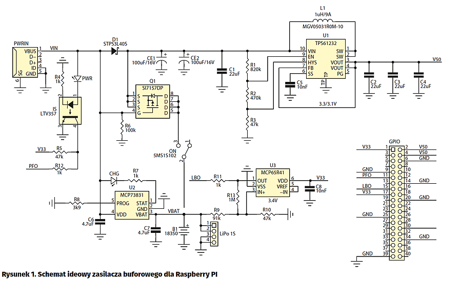 Schemat ideowy układu zasilacza buforowego pokazano na rysunku 1. Jako sterownik przetwornicy wybrany został TPS61232 firmy Texas Instruments. Układ do pracy wymaga jedynie dławika i kondensatorów filtrujących. Ma przy tym ustalone na 5 V napięcie wyjściowe i jest oferowany w obudowie VSON z wkładką radiatorową. Dodatkowo, w strukturze U1 jest zawarty układ komparatora z histerezą umożliwiający realizację zabezpieczenia podnapięciowego ULVO wraz z sygnalizacją poprawności zasilania PG (tu niewykorzystany). Klucz przetwornicy ma aktywny pomiar prądu z ograniczeniem do 5 A.