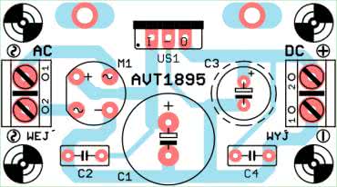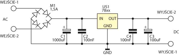 Schemat ideowy modułu pokazano na rysunku 1. Konstrukcja zasilacza jest oparta o podstawową aplikację stabilizatora LM78xx. Napięcie przemienne z transformatora jest doprowadzone przez złącze śrubowe AC (WEJŚCIE) i podawane na mostek Graetza (M1). Napięcie jest filtrowane (C1, C2) i stabilizowane (US1, C3, C4). Kondensatory C2 i C4 służą do zwierania zakłóceń wysokoczęstotliwościowych. Wydajność prądowa użytego stabilizatora wynosi maksymalnie 1,5 A i zależy od wielkości zastosowanego radiatora.