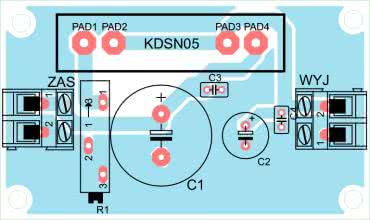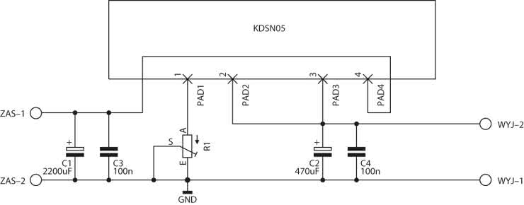 Moduł zasilacza (rysunek 1) jest złożony z bardzo małej liczby elementów, to znaczy: układu scalonego, 4 kondensatorów, 2 złączy ARK2 oraz potencjometru. Jego głównym elementem jest scalony stabilizator napięcia KDSN05, który ma wbudowane zabezpieczenia przed zwarciem i przeciążeniem, termiczne, a także ograniczenie maksymalnej mocy start.