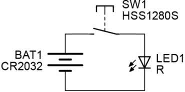 Schemat ideowy pokazano na rysunku 1. Zawiera on jedynie migającą diodę LED, do której dołączono źródło zasilania w postaci baterii 3 V (CR2032). W obwodzie zasilania znajduje się wyłącznik SW1. Migająca dioda LED oprócz struktury świecącej ma wbudowany miniaturowy układ sterujący, dzięki czemu może (i powinna) być zasilana bezpośrednio, z pominięciem rezystora ograniczającego jej prąd. Migające LED-y można poznać po ciemnej plamce wewnątrz obudowy. Dzięki sporym rozbieżnościom parametrów generatorów tych diod LED, każda z nich będzie migała z inną niepowtarzalną częstotliwością.