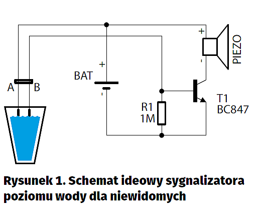 Schemat ideowy sygnalizatora pokazano na rysunku1. Działanie urządzenia polega na wykryciu zmniejszenia się rezystancji pomiędzy elektrodami „A” i „B”, w wyniku pojawienia się pomiędzy nimi cieczy przewodzącej wodę. W trybie spoczynkowym na bazie tranzystora T1 jest wymuszany poziom niski, co powoduje, że tranzystor ten nie przewodzi. Pojawienie się wody pomiędzy elektrodami A i B powoduje wysterowanie bazy tranzystora i w efekcie zadziałanie brzęczyka.