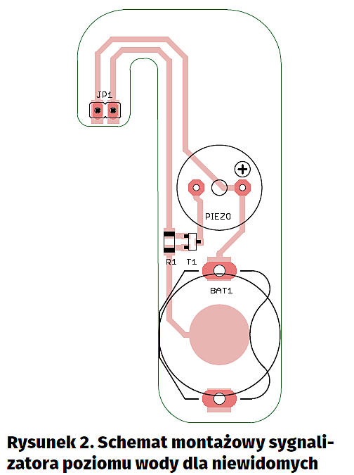 Cały układ jest zasilany z niewielkiej baterii typu CR2032. Pobór prądu w stanie spoczynku nie przekracza 1 mA, natomiast w czasie sygnalizacji wynosi około 10 mA. Układ zmontowano na płytce, której schemat montażowy pokazano na rysunku2. Jej kształt umożliwia łatwe zamocowanie gotowego sygnalizatora na krawędzi kubka lub dowolnego, innego naczynia. Ze względu na bezpośredni kontakt z żywnością w roli elektrod warto użyć popularnych, złoconych szpilek goldpin.