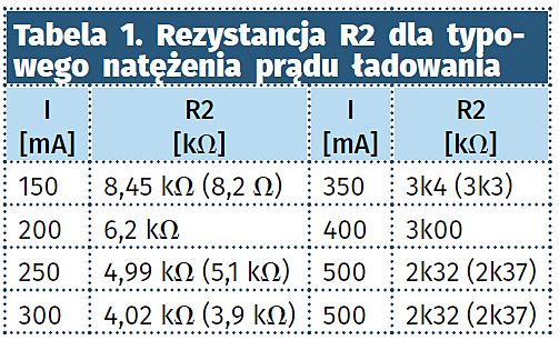 Za ładowanie ogniwa odpowiada specjalizowany układ MCP73123 firmy Microchip. Układ zawiera precyzyjną ładowarkę CC/CV, blokadę pracy UVLO, zabezpieczenia przepięciowe, stopień mocy z czujnikiem prądu ładowania. Cechą charakterystyczną układu jest możliwość programowania prądu ładowania poprzez zmianę wartości rezystora R2 pomiędzy wyprowadzeniem PROG i masą układu. Wartość prądu może być ustawiona od 130 mA, maksymalny prąd ładowania ograniczony jest do 1100 mA ułatwiając dopasowanie ładowarki do zastosowanego akumulatora. W modelu ze względu na ograniczenia portu USB oraz moc strat, nie zaleca się ładowania prądem większym niż 500 mA. Dokładną wartość prądu ładowania określa się z wzoru I [mA] = 1104 × Rprog-0,93 [kV]. Rezystancję R2 dla typowego natężenia prądu ładowania prezentuje tabela 1.