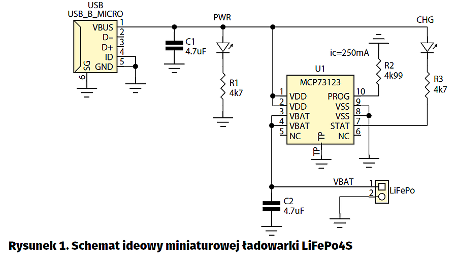 Napięcie znamionowe ok. 3,6 V przy połączeniu akumulatorów w baterię, ułatwia powolne wypieranie akumulatorów AGM z bardziej wymagających aplikacji. Niestety, podobnie jak w wypadku Li-Po/Li-Ion wymagana jest specjalna ładowarka, zapewniająca precyzyjny nadzór nad procesem ładowania. Opisywana ładowarka służy do ładowania ogniw 1S 18650, 26650 z wbudowanym układem zabezpieczającym PCM, prądem maksymalnym do 500 mA. Jej schemat ideowy pokazano na rysunku 1.