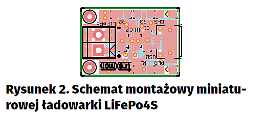 Ładowarka zasilana jest ze złącza mikro USB napięciem 5V. Diody sygnalizują odpowiednio PWR - obecność zasilania, CHG – ładowania ogniwa. Gniazdo śrubowe LiFePo służy do podłączenia ładowanego akumulatora. Kondensatory C1i C2 filtrują zasilanie. Ładowarkę zmontowano na dwustronnej płytce drukowanej. Rozmieszczenie elementów przedstawia rysunek 2. Montaż układu nie wymaga opisu, należy jednak zwrócić uwagę na poprawne przylutowanie pada termicznego U1.