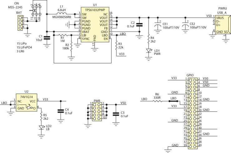Układ TPS6103x ma wbudowany obwód monitorowania zbyt niskiej wartości napięcia zasilania układu (LBI) - próg zadziałania wynosi 0,5 V. Dzielnik rezystancyjny R1/R2, dobierany w zależności od typu zastosowanego źródła zasilania, obniża napięcie baterii (akumulatora), aby zapewnić odpowiednio wczesną sygnalizację jej rozładowania. Sygnał z wyjścia LBO jest doprowadzony do GPIO22. Zwora LBO umożliwia odłączenie sygnału od GPIO przy kolizji z innymi płytkami HAT. Rezystor R6 zabezpiecza GPIO przed ewentualnymi skutkami zwarcia niepoprawnie skonfigurowanego wyprowadzenia. Bufor U2 zasila diodę sygnalizującą niski stan baterii LB.