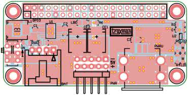 Montaż układu nie wymaga opisu, należy pamiętać o poprawnym przylutowaniu pada termicznego U1. Montaż złącza GPIO zależy od wymagań aplikacji. W podstawowym zastosowaniu do zasilania Pi może być użyte złącze PWRU i kabel micro USB. Przed połączeniem z Raspberry Pi należy dołączyć baterię lub akumulatory i po załączeniu przetwornicy skontrolować napięcie wyjściowe. Zależnie od baterii jest możliwe uzyskanie napięcia wyjściowego 5 V i prądu od 500…800 mA przy napięciu baterii 3…4,5 V.