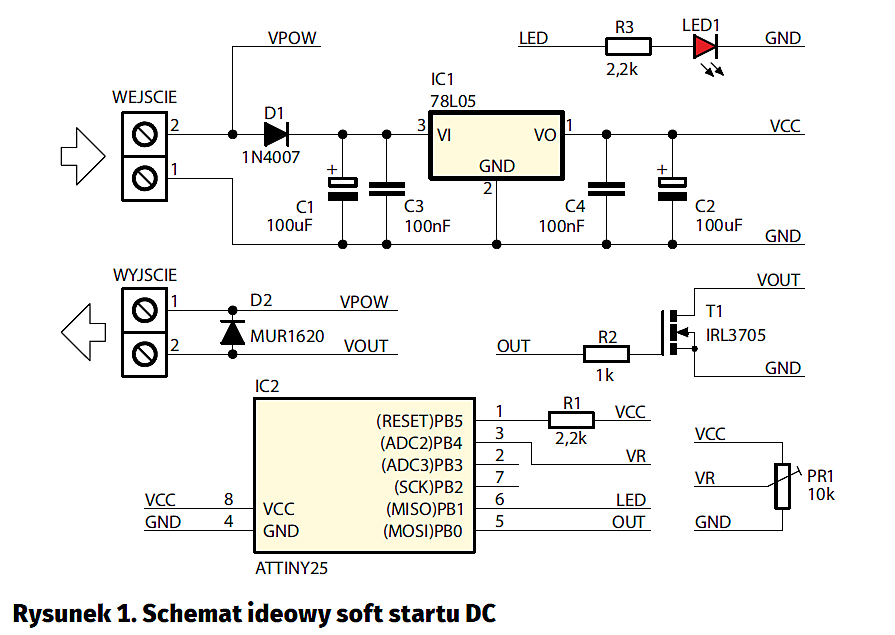 Schemat ideowy soft startu pokazano na rysunku 1. Moduł jest włączany pomiędzy źródło zasilania a odbiornik. Powinien być zasilany napięciem stałym – może to być akumulator lub dowolny zasilacz o wydajności prądowej odpowiadającej dołączonemu obciążeniu. Dioda D1 stanowi zabezpieczenie przed niewłaściwą polaryzacją. Napięcie wejściowe jest podawane na stabilizator IC1 typu 78L05, natomiast kondensatory C1...C4 stanowią filtr zasilania.