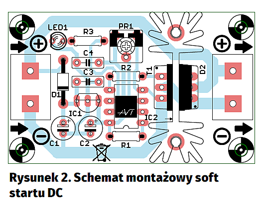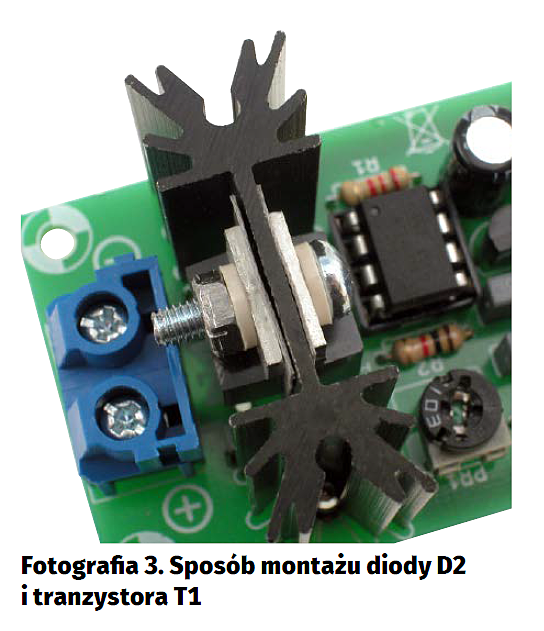 Moduł zmontowano na płytce drukowanej o wymiarach 35 mm×57 mm, której schemat montażowy pokazano na rysunku 2. Montaż rozpoczynamy od wlutowania w płytkę rezystorów i innych elementów o niewielkich wymiarach, a kończymy, montując podstawkę, kondensatory elektrolityczne, złącza śrubowe oraz tranzystor z diodą zabezpieczającą. Ponieważ tranzystor T1 z diodą D2 montowane są na wspólnym radiatorze (fotografia 3), należy je bezwzględnie od siebie odizolować, stosując w tym celu podkładki silikonowe oraz tulejki izolacyjne.