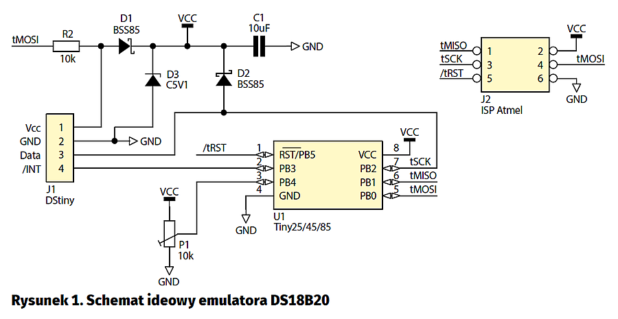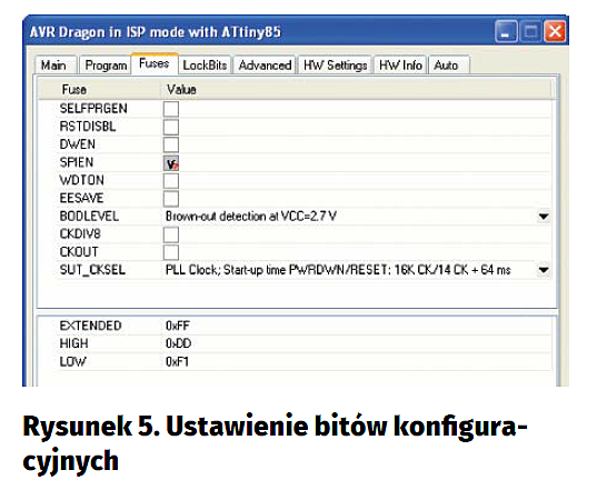 Schemat montażowy emulatora pokazano na rysunku 4. Emulator nie wymaga uruchamiania. Przy wgrywaniu programu do mikrokontrolera trzeba odpowiednio ustawić bity konfiguracyjne – rysunek 5. Jeśli chcemy przyłączyć kilka emulatorów do jednej magistrali, to trzeba pamiętać, aby dla każdego z nich skompilować kod z innym numerem identyfikacyjnym. Zakładając zworkę na piny 4–6 złącza J2, emulujemy pasożytnicze zasilanie termometru.W czasie odczytu bitu IRQ są zawieszane na około 6 ms i biorąc pod uwagę, że wejście i wyjście w obsługę przerwania to około 5 ms, zastąpienie _delay_us(15-DELAYDAMPLEBIT), gdzie DELAYDAMPLEBIT=8 (tyle wynosi czas od wejścia w IRQ do skoku w funkcję odczytu bitu), niepotrzebnie komplikuje kod, nie dając wymiernego zysku czasowego.