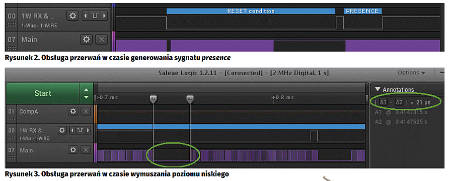 Schemat ideowy emulatora pokazano na rysunku 1. Jak można zauważyć już na pierwszy rzut oka, jest to jedno z tych urządzeń, których „moc” tkwi w oprogramowaniu. Nie jest łatwo wykonać emulator urządzenia dołączanego za pomocą 1-Wire. Kryteria czasowe protokołu komunikacyjnego są dość restrykcyjne. Więcej na ten temat napisałem w artykule „1-Wire emulator & skaner”, który wkrótce ukaże się na łamach EP. Tu jedynie zasygnalizuję, że na czas analizowania sygnału reset i generowania sygnału presence obsługa przerwań prawie nie jest zawieszana (rysunek 2). Przerwa w realizacji programu głównego podczas oczekiwania na reset jest spowodowana oczekiwaniem na opadające zbocze impulsu reset. Procedurę można udoskonalić i po wykryciu poziomu niskiego trwającego ponad 460 ms włączyć przerwanie od zbocza narastającego na wejściu INT. W tej wersji oprogramowania nie zdecydowałem się na to, ponieważ program główny i tak prawie nic nie robi. W czasie generowania „zera” przerwania też nie są zawieszane (rysunek 3).