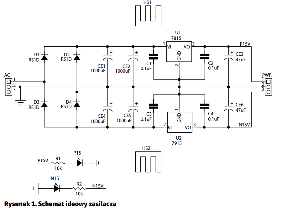 Schemat ideowy zasilacza pokazano na rysunku1. Układ jest typowym zasilaczem symetrycznym ±15 V. Symetryczne napięcie przemienne ze złącza AC (16…18 V AC) jest doprowadzone do prostownika mostkowego D1…D4, a po filtrowaniu za pomocą kondensatorów CE1, CE2, C4, C5 zasila stabilizatory +15 V (U1), –15 V (U2). Napięcie wyjściowe jest dostępne na złączu PWR, jego obecność sygnalizują LED P15, N15. Układy U1, U2 wyposażono w radiatory. W zależności od obciążenia zasilacza można zastosować radiatory HS135 lub zgodne, o wysokości 25 mm, 38 mm, 50 mm. Pobór prądu nie powinien przekraczać 400 mA, co w zupełności wystarcza do zasilania kilku modułów.