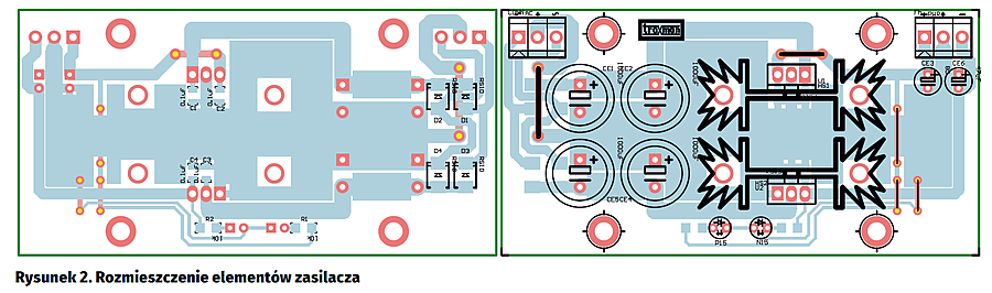 Zasilacz zmontowano na jednostronnej płytce drukowanej. Schemat montażowy przedstawia rysunek 2.
