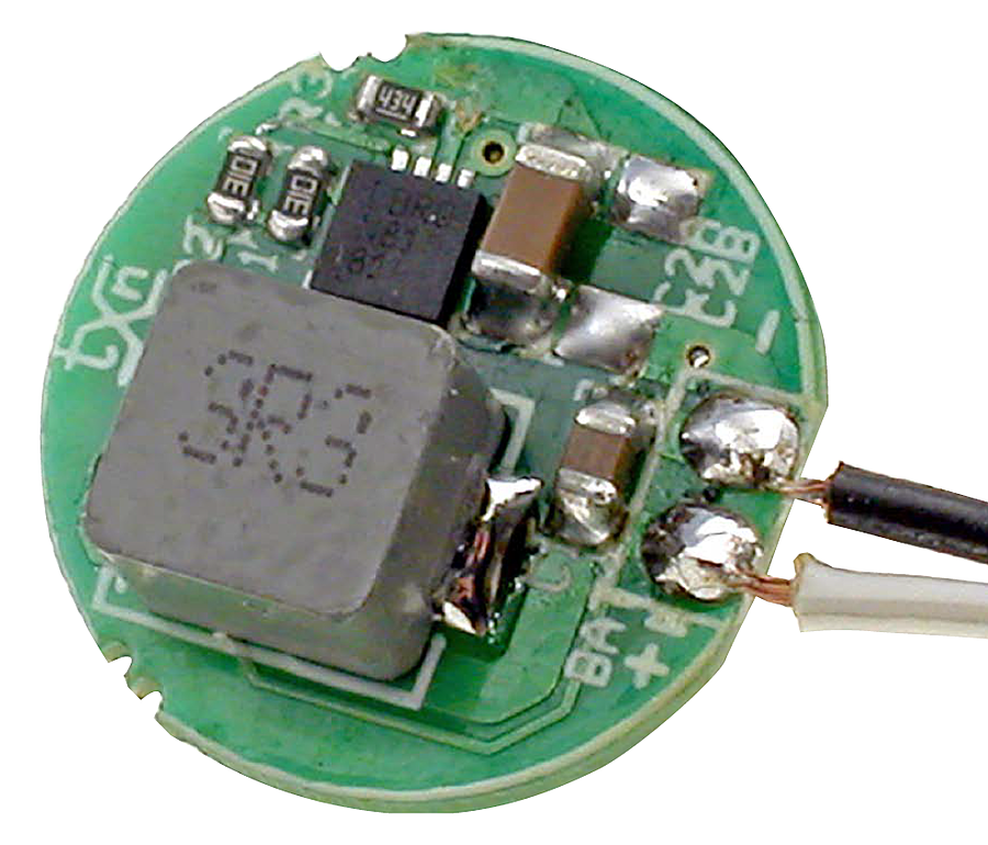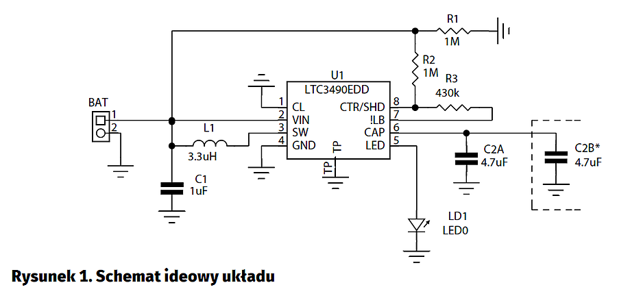 Napięcie zasilania 1,5 V ze złącza BAT doprowadzono do układu U1. Kondensator C1 filtruje zasilanie, dławik L1 jest elementem przetwornicy podwyższającej napięcie. Wyprowadzenie CL określa poziom zabezpieczenia ULVO, odpowiedni dla jednego ogniwa 1,5 V. Kondensatory C2A i opcjonalny C2B filtrują zasilanie LED. Wyjście LB sygnalizuje niski poziom napięcia baterii, wejście CTR/SHD, służy do załączenia układu przez podanie stanu wysokiego oraz do kontroli prądu LED dzięki zmianie wartości napięcia. W modelu wyjście LB steruje dzielnikiem R2/R3, obniżając jasność LED przy niskim stanie napięcia baterii, wydłużając czas świecenia. Jeżeli „ściemnianie” nie jest wymagane, można pominąć montaż R3, a R2 zastąpić zworą 0 V.