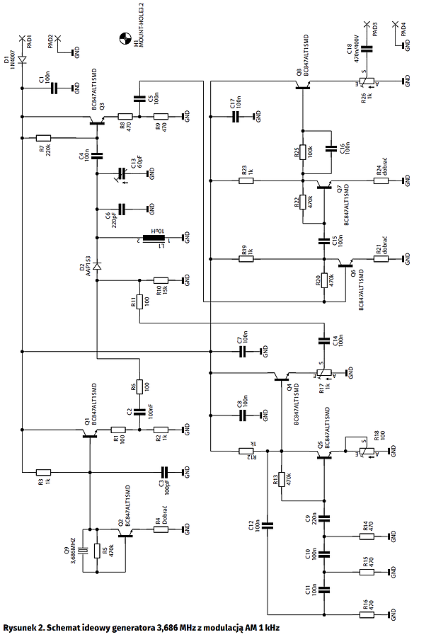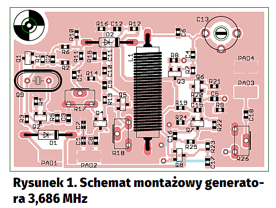 Schemat montażowy generatora zamieszczono na rysunku 1. Do uruchomienia jest potrzebny oscyloskop i miernik częstotliwości. Dołączamy oscyloskop do emitera tranzystora Q4 i za pomocą R18 ustawiamy sygnał 1 kHz bez zniekształceń. Do emitera tranzystora Q1 można przyłączyć miernik częstotliwości i sprawdzić częstotliwość 3,686 MHz. Rezystor R4 można dobrać pod katem prawidłowego kształtu sygnału sinusoidalnego 3,686 MHz. Później dołączamy oscyloskop do kondensatora C5 – zmieniając wartości rezystancji R17 i pojemności C13, można ustawić prawidłowy przebieg AM. Obserwując przebieg na emiterze tranzystora Q8, można dobrać oporniki R21 i R24 tak, aby uzyskać na oscyloskopie prawidłowy sygnał AM bez zniekształceń, o amplitudzie około 2,5 V.