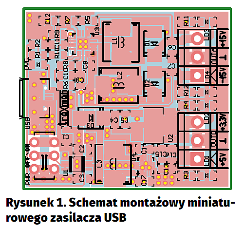 Układ zmontowano na niewielkiej, dwustronnej płytce drukowanej, której schemat montażowy pokazano na rysunku 1. Montaż nie wymaga opisu, należy tylko poprawnie przylutować pady termiczne i wyczyścić płytkę z topnika. Gotowy zasilacz nie wymaga uruchamiania. Warto jednak sprawdzić napięcia wyjściowe przed zasileniem zewnętrznego urządzenia.