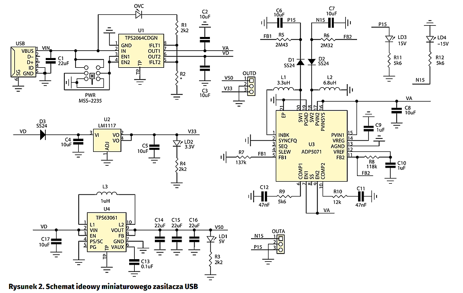 Napięcie USB 5V doprowadzono przez typowe gniazdo micro USB do układu zarządzania zasilaniem U1 (TPS2064). Zawiera on dwa niezależne klucze zasilania z wbudowanym pomiarem prądu i zabezpieczeniem przeciążeniowym. Układ jest aktywowany przełącznikiem PWR poprzez podanie poziomu wysokiego na wejścia EN. Dwa niezależne kanały są używane do podziału zasilania na grupę „analogową” (VA) służącą do generowania ±15 V oraz grupę „cyfrową” (VD) dla zasilaczy 5 V i 3,3 V. LED OVC sygnalizuje zadziałanie zabezpieczenia przeciążeniowego. Opcjonalny rezystor R2 (ok. 2,2 kV) umożliwia sygnalizację poziomem świecenia OVL, także poprawnego zasilania z USB – w modelu nie jest używany.