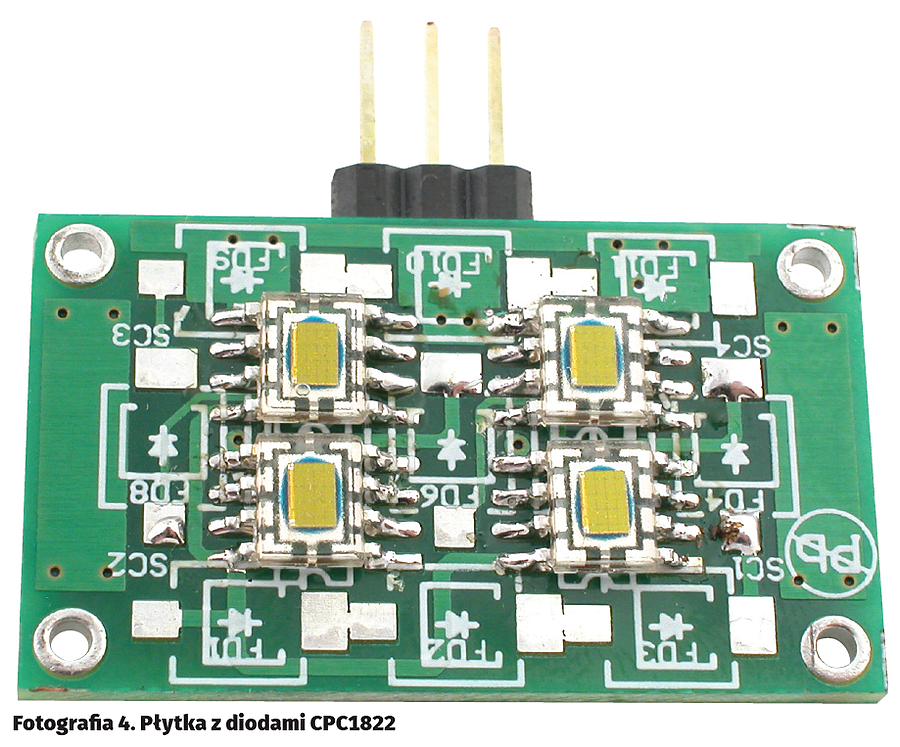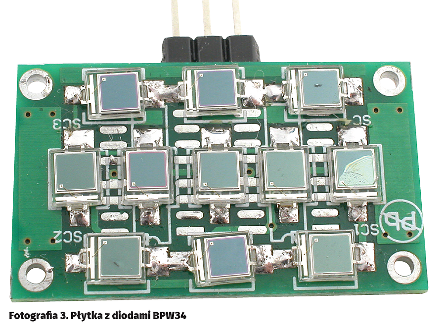 W praktyce, dla modułu z diodami BPW (fotografia 3) do rozpoczęcia pracy wystarczy oświetlenie żarówką o mocy 20 W z odległości ok. 1 m, dla modułu z CPC1622 (fotografia 4) jest wymagane silniejsze oświetlenie. Dla sprawdzenia pracy do wyjścia należy dołączyć rezystor 100 kV oraz woltomierz napięcia stałego. Po oświetleniu fotoogniw i naładowaniu CE1 na wyjściu powinno wystąpić napięcie. Po usunięciu źródła światła napięcie będzie malało aż do osiągnięcia progu dolnego, który wyłączy napięcie wyjściowe. Po sprawdzeniu uruchomieniu pozostaje tylko życzyć powodzenia w wyłapaniu fotonów z otoczenia