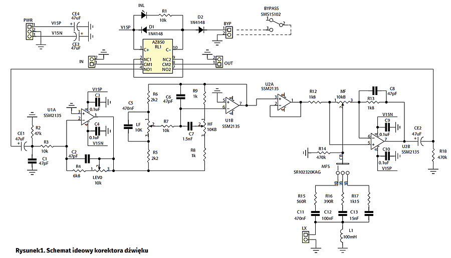 Układ korekcyjny wykonano w konfiguracji klasycznego regulatora Baxandalla. Regulacja poziomu tonów niskich odbywa się potencjometrem „LF”, wysokich „HF”. Z regulatora barwy LF/HF poprzez bufor U2A sygnał jest podawany na regulator selektywny, oparty na indukcyjności L1. Potencjometr „MF” umożliwia regulację poziomu tonów średnich, przełącznik „MFS” wybiera regulowaną częstotliwość. Zmieniając L1/C11…C13, można ustalić inne, wymagane częstotliwości regulacji. Rezystorami R15…R17 można zmienić dobroć regulacji. Z wyjścia U2B sygnał jest doprowadzony do zacisków OUT.