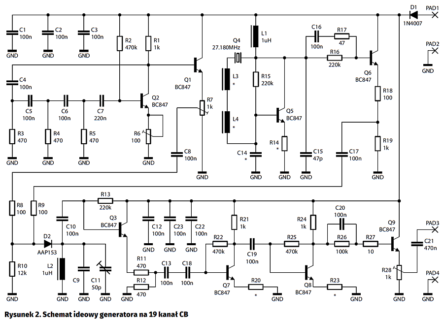 Schemat montażowy generatora zamieszczono na rysunku 1. Do uruchomienia potrzebny będzie oscyloskop i miernik częstotliwości. Dołączamy oscyloskop do emitera Q1 i za pomocą R6 ustawimy sygnał 1 kHz bez zniekształceń. Do emitera Q6 można przyłączyć miernik częstotliwości i za pomocą L4 i L3 należy ustawić częstotliwość 27,180 MHz. Dławikami przesuwa się częstotliwość rezonatora w dół. Aby przesunąć częstotliwość w górę, można w miejsce L4 i L3 włączyć kondensator zmienny, ustawić częstotliwość, a po zmierzeniu pojemności można wlutować kondensator stały. Jeśli L4 i L3 są zbędne, to zastępujemy je zworą. Rezystor R14 można dobrać na prawidłowy kształt przebiegu sinusoidalnego 27,180 MHz bez zniekształceń.