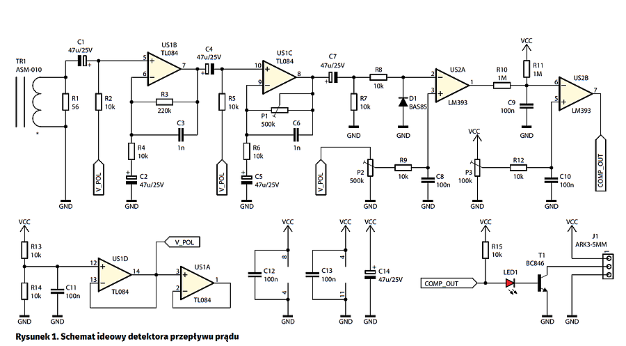 Przedstawiony detektor jest przewidziany do zasygnalizowania, że w przewodzie przewleczonym przez przekładnik prądowy płynie prąd o amplitudzie większej niż zadana. Przystosowano go do pracy z siecią o częstotliwości 50 Hz lub 60 Hz.