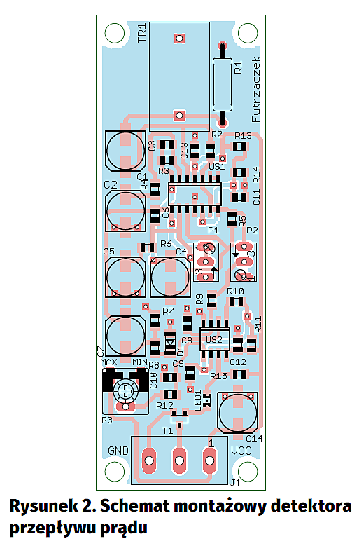 Detektor zmontowano na pojedynczej, dwustronnej płytce drukowanej o wymiarach 28 mm×78 mm, której schemat montażowy przedstawia rysunek 2. Wszystkie elementy zostały zamontowane od strony wierzchniej, zaś strona spodnia jest płaszczyzną masy. Większość elementów jest montowana powierzchniowo i to od nich należy rozpocząć montaż. Zagęszczenie podzespołów jest duże, dlatego należy pamiętać o przylutowaniu wysokich kondensatorów elektrolitycznych na końcu. Dopiero po nich można wlutować rezystor R1, potencjometry, złącze ARK i na końcu przekładnik. Prawidłowo zmontowane urządzenie pobiera ok. 10 mA przy zasilaniu napięciem 12 V DC. Do prawidłowego działania potrzebne jest jego wyregulowanie według następujących kroków: