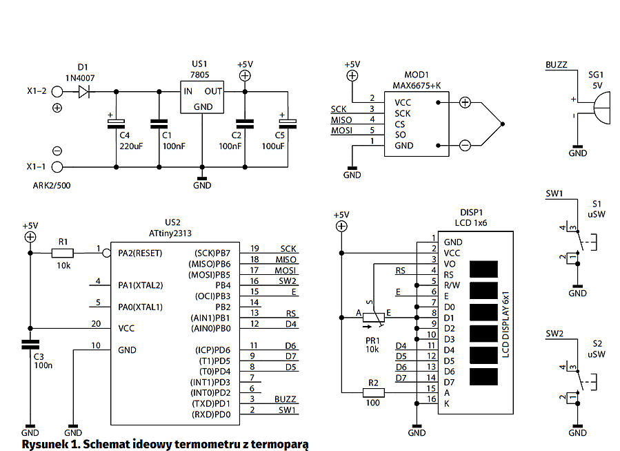 Schemat ideowy termometru pokazano na rysunku1. W zależności od możliwości i potrzeb układ można zasilać napięciem stałym z zakresu 8…15 V. Napięcie podawane do złącza X1 przez diodę D1 jest doprowadzone do stabilizatora US1, który dostarcza napięcie +5 V. Pracą modułu steruje taktowany wewnętrznym sygnałem zegarowym mikrokontroler ATtiny2313, a dokładniej zawarty w nim program. Aby zapewnić bezbłędny pomiar temperatury, zastosowano specjalizowany moduł z układem scalonym z wbudowaną kompensacją zimnych końców firmy Maxim-Dallas MAX6675 mający interfejs SPI, przez który komunikuje się z mikrokontrolerem.