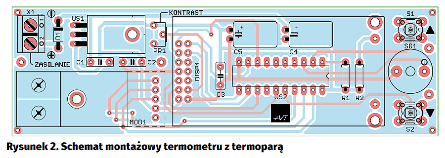 Moduł należy zmontować na dwustronnej płytce drukowanej pokazanej na rysunku2. Ułatwieniem podczas montażu będzie fotografia3 przedstawiająca szczegóły umieszczenia elementów pod wyświetlaczem oraz modułu z MAX6675 i termoparą. Montaż należy rozpocząć od wlutowania w płytkę rezystorów i innych elementów o niewielkich wymiarach. Następnym krokiem będzie montaż modułu termopary, który przykręcamy śrubką M2,5 przez nakrętkę między płytkami. Taki montaż pozwala wyrównać wysokości kątowych goldpinów modułu i płytki głównej, a tym samym ich zlutowanie. Jako ostatni element montowany będzie wyświetlacz.