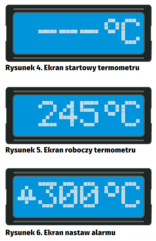 Po zmontowaniu modułu trzeba bardzo starannie skontrolować, czy elementy nie zostały wlutowane w niewłaściwym kierunku lub w niewłaściwe miejsca, a przede wszystkim czy podczas lutowania nie powstały zwarcia punktów lutowniczych. Urządzenie zmontowane bezbłędnie, ze sprawnych elementów i z użyciem zaprogramowanego mikrokontrolera, będzie działało od razu po włączeniu napięcia zasilającego. Jedyną czynnością, jaką należy wykonać, jest wyregulowanie kontrastu wyświetlacza potencjometrem PR1. Przy każdorazowym uruchomieniu na wyświetlaczu jest pokazywany obraz jak na rysunku4. Taki sam ekran oraz sygnał alarmu pojawi się, gdy od modułu pomiarowego zostanie odłączony czujnik lub ulegnie on uszkodzeniu. W normalnym cyklu pracy wyświetlany będzie ekran z rysunku5 zawierający mierzoną temperaturę, natomiast gdy zostanie naciśnięty jeden z przycisków, zostanie wyświetlony ekran z wartością nastawionej temperatury, po przekroczeniu której ma pojawić się alarm (rysunek6).