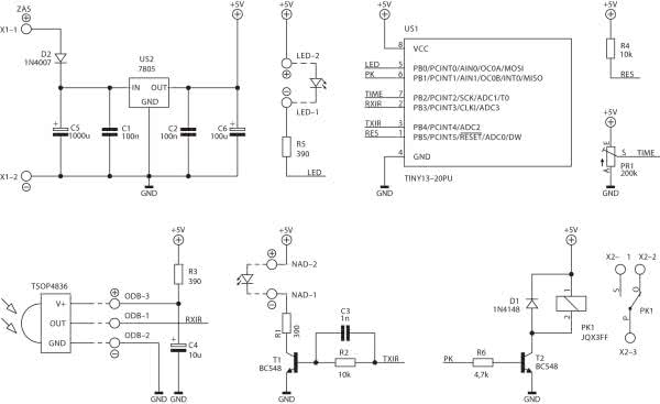 Schemat włącznika zamieszczono na rysunku 1. Urządzenie jest przystosowane do zasilania napięciem 8…12 V DC. Dioda prostownicza D2 zabezpiecza przed niewłaściwą polaryzacją. Napięcie zasilające jest stabilizowane przez US2. Za funkcjonalność włącznika jest odpowiedzialny mikrokontroler ATtiny25 taktowany wewnętrznym sygnałem zegarowym. Użyty odbiornik podczerwieni to scalony układ pracujący z modulowanym światłem z zakresu bliskiej podczerwieni TSOP4836. Jego zaletą jest mała wrażliwość na widzialne światło z otoczenia. Mikrokontroler okresowo generuje serię impulsów załączających diodę IR. Impulsy te mają częstotliwość ok. 36 kHz, dzięki czemu trudniej oszukać odbiornik obcym sygnałem podczerwieni np. pochodzącym z pilota RTV. Kondensator C3 poprawia szybkość zmian napięcia na diodzie, w szczególności przy wychodzeniu tranzystora T1 ze stanu nasycenia. W przypadku gdy część wyemitowanego światła odbije się od znajdującego się w strefie roboczej obiektu, scalony odbiornik TSOP4836 wystawi ciąg impulsów na swoim wyjściu. W tym momencie następuje również odczytanie położenia suwaka potencjometru PR1 i załączenie przekaźnika PK1 poprzez tranzystor T2. Czas załączenia jest regulowany w zakresie od ok. 10 sekund do 5 minut.