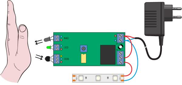 Ponadto, dla prądów przekraczających 2 A, wskazane jest pogrubienie ścieżek. Przekaźnik jest galwanicznie odizolowany od napięcia zasilającego moduł – oznacza to, że styki COM, NO i NC są bezpotencjałowe. Można dołączyć do nich dowolne napięcie mieszczące się w parametrach pracy przekaźnika. Zanieczyszczenie powietrza i zabrudzenie układu optycznego skróci strefę działania włącznika. Rysunek 3 przedstawia przykładowe zastosowanie modułu do włączania taśmy LED.