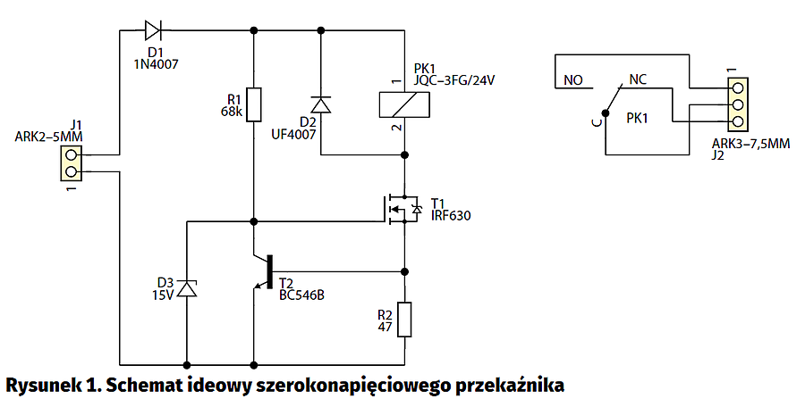 Dioda Zenera D3 zapobiega przebiciu izolacji bramka-źródło tranzystora T1, ponieważ układ można zasilać napięciem znacznie wyższym od dopuszczalnej dla niego wartości 20 V. Ogranicza również napięcie kolektor-emiter T2 do 15 V, przez co nie musi to być tranzystor wysokonapięciowy. Jednocześnie, jest to napięcie na tyle duże, że można w pełni otworzyć tranzystor T1, jeżeli zaszłaby taka potrzeba. Rezystor R3 polaryzuje diodę Zenera prądem o niewielkim natężeniu. Jego wartość nie ma większego znaczenia, musi być jedynie znacząco większy od zerowego prądu kolektora tranzystora T2. Wielką zaletą tego układu, w porównaniu do użycia w jego miejsce przetwornicy impulsowej typu step-down, jest brak emisji zaburzeń EMI oraz bezzwłoczne działanie. W układzie nie ma znaczących pojemności, więc czas reakcji elektroniki jest wielokrotnie szybszy od czasu reakcji przekaźnika.