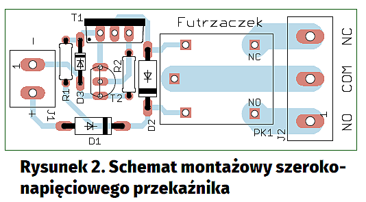 Poprawnie zmontowany układ nie wymaga dodatkowych czynności uruchomieniowych i jest od razu gotowy do pracy. Gdyby moc tracona na tranzystorze T1 okazała się zbyt duża, należy dodać do niego radiator. Jeżeli minimalne napięcie zasilające będzie zbliżone do znamionowego napięcia pracy przekaźnika, można usunąć diodę D1 zastępując ją zworą, co zmniejszy minimalny spadek napięcia do ok. 0,7 V. Ścieżki łączące wyprowadzenia styków przekaźnika ze złączem mają szerokość 4,5 mm. Gdyby zaszła konieczność przewodzenia prądu o natężeniu powyżej ok. 8 A, można je dodatkowo pogrubić. Dla ułatwienia usunięto z nich maskę lutowniczą.