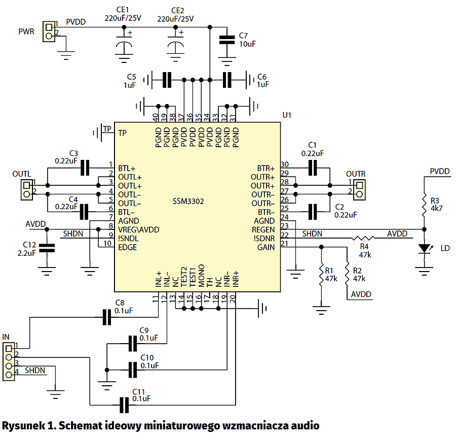 Układ SSM3302 jest dwukanałową końcówką mocy ze zintegrowanymi tranzystorami przełączającymi. Ma wbudowane wszystkie konieczne zabezpieczenia przed uszkodzeniem Może być zasilany w szerokim zakresie 7…18 V, sterując obciążeniem o rezystancji 4…8 V. Przy napięciu zasilającym 12V moc dostarczana do obciążenia wynosi 2×10 W/4 V lub 2×8 W/8 V. Ze względu na dużą sprawność wzmacniacz nie wymaga stosowania radiatora – do odprowadzania nadmiaru ciepła wystarczy miedź płytki drukowanej.