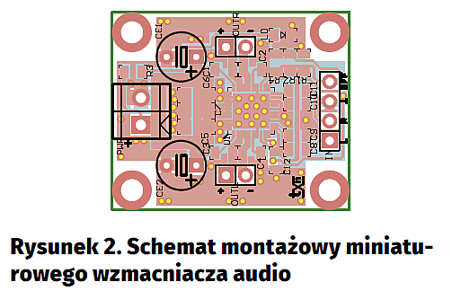 Wzmacniacz zmontowano na miniaturowej, dwustronnej płytce drukowanej, której schemat montażowy pokazano na rysunku 2. Przed montażem należy ustalić wymagane wzmocnienie (R1/R2). Montaż jest typowy i nie wymaga opisywania.