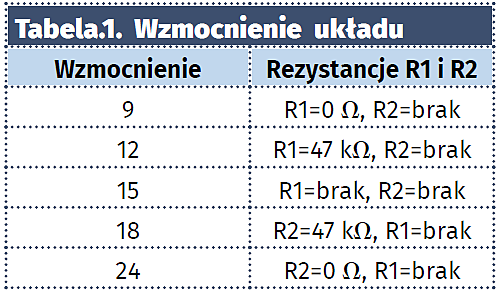 Schemat ideowy wzmacniacza pokazano na rysunku 1. Aplikacja nie odbiega od noty katalogowej producenta – firmy Analog Devices. Sygnał wejściowy doprowadzony jest do złącza IN. Różnicowe wejścia układu skonfigurowane są do pracy z sygnałem niesymetrycznym poprzez połączenie ich kondensatorami C9 i C10 z masą układu. Sygnał audio po separacji galwanicznej za pomocą pojemności C8 i C11 jest doprowadzony do układu U1. Wzmocnienie końcówki jest ustalane rezystorami R1 i R2 dołączonymi do wyprowadzenia GAIN. Wzmocnienie można ustalić zgodnie z tabelą1.