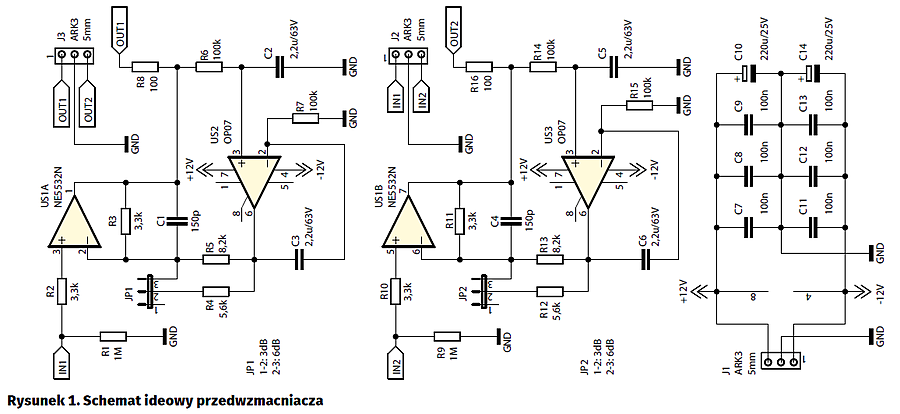 Przedstawiony układ jest dwukanałowym wzmacniaczem napięciowym o wzmocnieniu +6 dB lub +3 dB. Dodatkową funkcjonalnością jest zerowy poziom składowej stałej napięcia wyjściowego, nawet, jeżeli znajduje się ona sygnale wejściowym. Schemat układu jest widoczny na rysunku 1. Składa się z dwóch identycznych bloków, więc omówiony zostanie tylko jeden z nich. Wzmocnienie napięciowe jest realizowane przy użyciu wzmacniacza operacyjnego US1A. W jego otoczeniu znajdują się elementy, które czynią z niego wzmacniacz napięciowy o szerokim paśmie przenoszenia. W układzie prototypowym użyto NE5532, gdyż bardzo często zaprzęga się go do pracy w układach audio, choć nie ma przeciwwskazań, by użyć innego podwójnego układu wzmacniacza operacyjnego o tym samym rozkładzie wyprowadzeń.