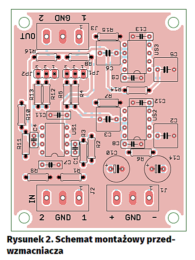 Schemat montażowy płytki drukowanej dla tego układu pokazano na rysunku 2. Jej wymiary to 68 mm×54 mm, zaś w odległości 4 mm od krawędzi płytki znajdują się otwory montażowe. Wszystkie układy scalone są zasilane napięciem symetrycznym. Wejścia zasilania każdego z nich są filtrowane kondensatorami o pojemności 100 nF, co zapobiega wzbudzeniom i utrudnia przenikanie zakłóceń z linii zasilających do sygnału. Wszystkie zastosowane elementy są w obudowach do montażu przewlekanego, więc montaż tego układu nie powinien nastręczać trudności nawet początkującym elektronikom. Pod układy scalone polecam zastosować podstawki. Montaż należy przeprowadzić w typowej kolejności – od elementów najniższych po najwyższe.