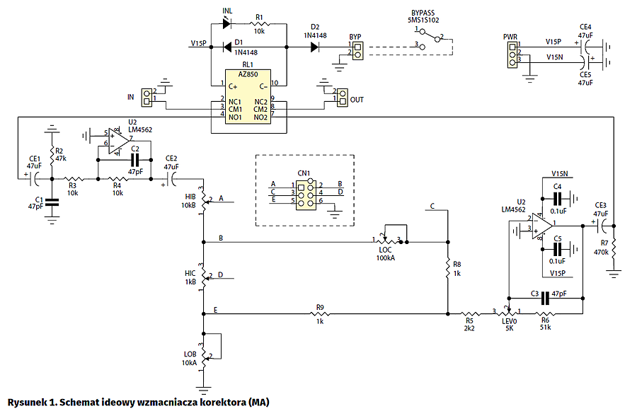 Schemat układu wzmacniacza korektora pokazano na rysunku 1, a obwodów filtrów na rysunku 2. Sygnał wejściowy z gniazda IN jest doprowadzony do bufora odwracającego ze wzmacniaczem U2B. Przekaźnik RL1 jest odpowiedzialny ominięcie toru korektora przekazując sygnał z wejścia na wyjście bez jakiejkolwiek zmiany, gdy moduł ma wyłączone zasilanie (ułatwia to budowę torów szeregowych) lub gdy jest wyłączony przełącznikiem BYPASS dołączonym do złącza BYP. Pracę korektora w torze audio sygnalizuje dioda INL. Sygnał buforowany przez U2B jest doprowadzony do korektora biernego.