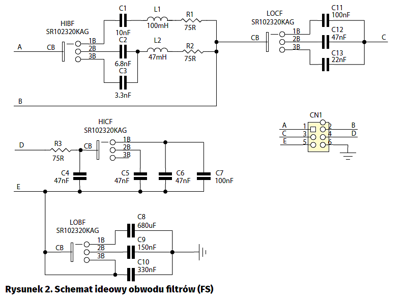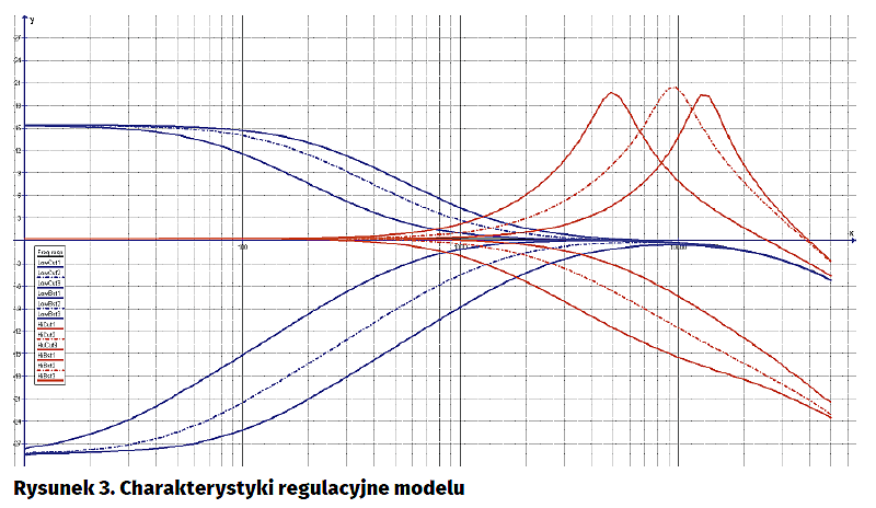 Ostatnią regulatorem jest potencjometr LOB (Low Boost – podbicie tonów niskich). Współpracuje on z kondensatorami C8…C10 wybieranymi przełącznikiem LOBF ustalającymi zakres podbijanych częstotliwości. W położeniu minimalnym LOB kondensatory są zwarte i nie mają wpływu na charakterystykę częstotliwościową. Sygnał wyjściowy z regulatora biernego jest doprowadzony do wzmacniacza U2A, który odpowiada za buforowanie i wyrównanie poziomu wyjściowego korektora. Potencjometr LEV0 ustala jednostkowe wzmocnienie układu. Charakterystyki regulacyjne modelu dla skrajnych położeń potencjometrów i wszystkich pozycji przełączników przedstawia rysunek 3.