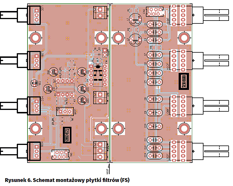 Schemat montażowy płytek korektora pokazano na rysunkach 5 i 6. Zmontowano go na dwóch dwustronnych płytkach drukowanych: wzmacniacza (MA) i filtrów (FS). Sposób montażu jest typowy i nie wymaga opisywania. Gotowy korektor nie wymaga uruchamiania. Należy jedynie potencjometrem LEV0 ustalić wzmocnienie jednostkowe w skrajnych, lewych położeniach potencjometrów. Układ jest bardzo elastyczny pod względem doboru elementów, więc warto poeksperymentować i dobrać cewki oraz kondensatory pod kątem własnych upodobań.