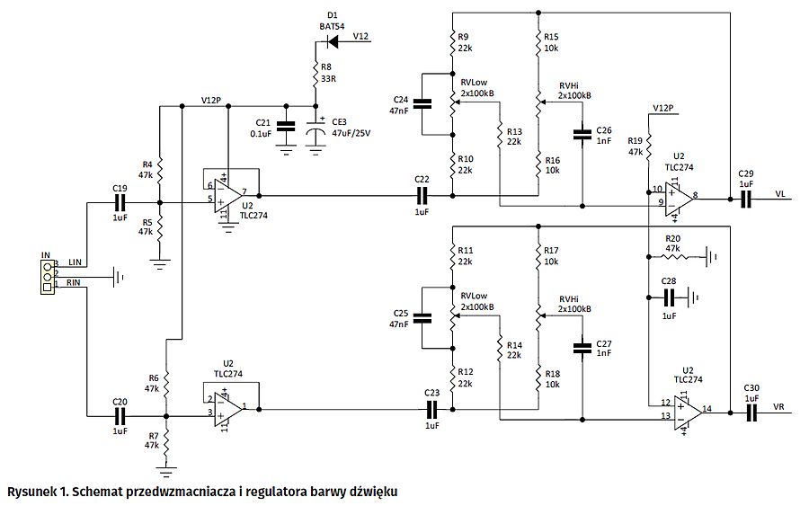 Dla podwyższenia funkcjonalności wzmacniacz mocy wyposażono w przedwzmacniacz z regulacją barwy dźwięku z układem Baxandala. Schemat układu przedwzmacniacza i regulacji barwy dźwięku pokazano na rysunku 1. Sygnał audio z gniazda wejściowego IN jest doprowadzony do bufora (U2-1, U2-2). Kondensatory C19, C20 separują sygnał od składowej stałej. Dzielniki rezystancyjne R4…R7 polaryzują wejścia układu U2 na poziomie połowy napięcia zasilającego. Następnie sygnał jest doprowadzony do regulatora barwy dźwięku. Potencjometr RVLow odpowiada za regulowanie poziomu tonów niskich, a RVHi za regulowanie poziomu tonów wysokich. Częstotliwości regulacji określają: dla tonów niskich kondensatory C24 i C25, wysokich C26 i C27 (oczywiście, można je zmienić zgodnie z własnymi upodobaniami). Zasilanie wzmacniaczy jest filtrowane za pomocą rezystora R8 i kondensatorów C21, CE3. Obwód RC złożony z rezystancji R19, R20 oraz pojemności C28 polaryzuje wzmacniacze U2-3 i U3-4. Kondensatory sprzęgające stopnie mają małą pojemność, ponieważ głośniki współpracujące z prototypem nie przenosiły niskich częstotliwości. Nic oczywiście nie stoi na przeszkodzie, aby zwiększyć ich pojemność z 1 mF do na przykład: 4,7…22 mF poszerzając pasmo przenoszenia od dołu.