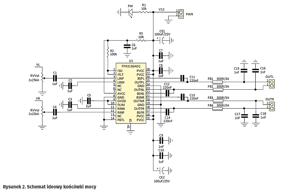 Schemat montażowy wzmacniacza zamieszczono na rysunku 3. Zmontowano go na dwustronnej płytce drukowanej. Montaż jest typowy i nie wymaga opisywania. Układ TPA3136AD2 odprowadza ciepło przez wkładkę radiatorową od spodu układu, która musi być poprawnie przylutowana. Dla usprawnienia odprowadzania ciepła można na U1 nakleić niewielki radiator aluminiowy. Moduł nie wymaga uruchamiania – zmontowany ze sprawnych elementów działa po włączeniu zasilania.