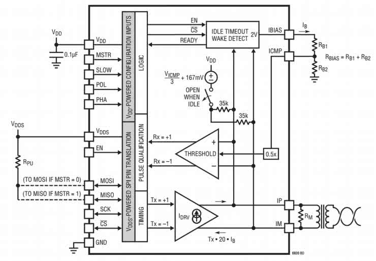 LTC6820 jest skonfigurowany jest do pracy jako nadajnik lub odbiornik sygnału, dzięki temu do realizacji magistrali wystarczy jeden typ układu.