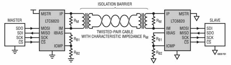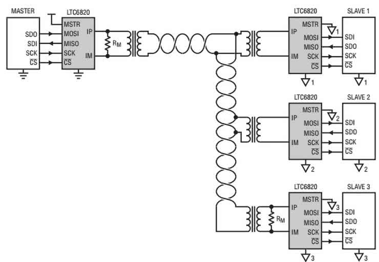 Ważną zaletą układu LTC6820 jest wykorzystywanie do realizacji, izolacji typowych transformatorów separujących (identycznych jak w kartach sieciowych PC) oraz kabla UTP jako medium transmisyjnego. Rozwiązanie z rysunku 3 jest szczególnie chętnie wykorzystane w przemyśle samochodowym, np. do monitorowania stanu wielu szeregowo połączonych akumulatorów za pomocą typowych przetworników A/C z interfejsem SPI, współpracujących z jednym procesorem monitorującym stan ogniw.